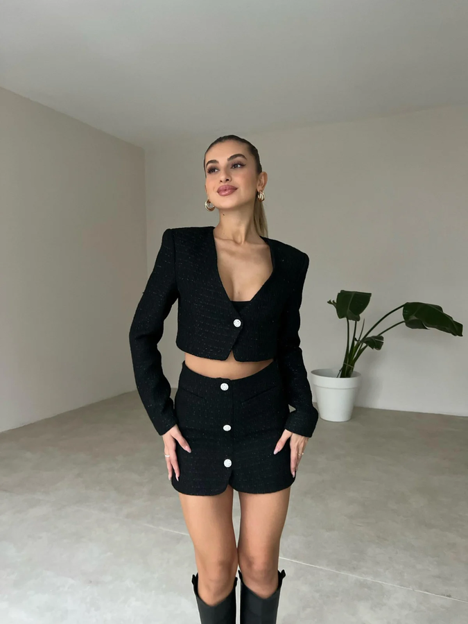 Costum de dama negru compus din doua piese, sacou scurt cu maneca lunga si fusta scurta.