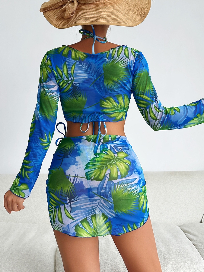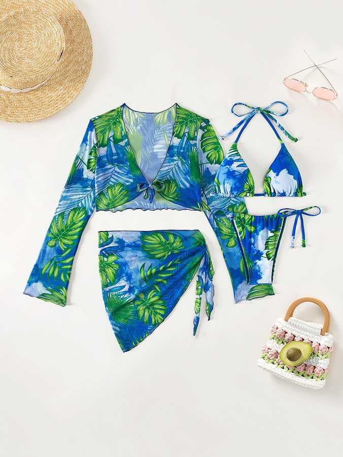 Set costume de baie dama 4 piese cu imprimeu frunze. Slip reglabil pe snur, sutien cu pernite de burete detasabil si bretele subtiri reglabile. Esarfa si top din material elastic, semitransparent.