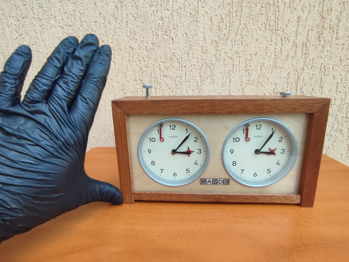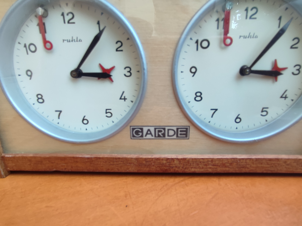 Vand cronometru profesional de sah "Ruhla Garde" din Germania anilor '80. Acest model de cronometru a fost folosit la campionatul mondial de sah din 1993, la meciul dintre Gary Kasparov si Nigel Short. Cronometrul este mecanic si perfect functional. Starea din poze.