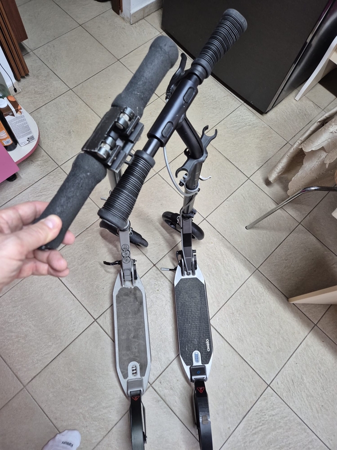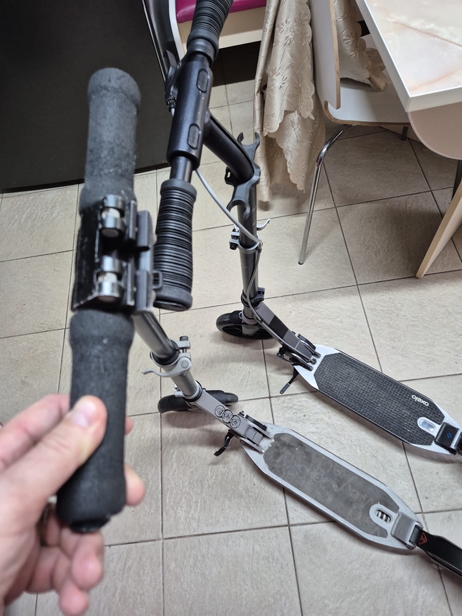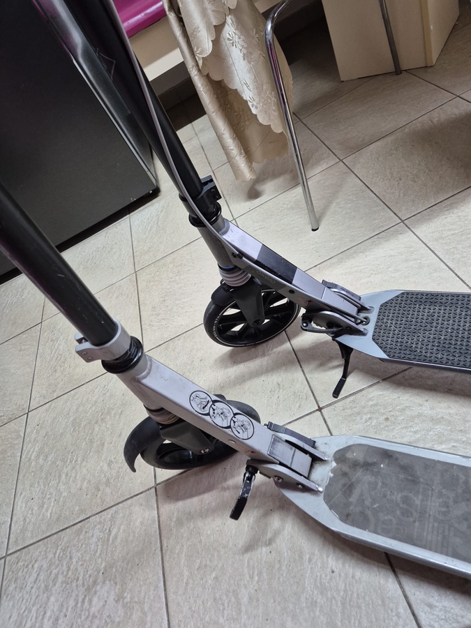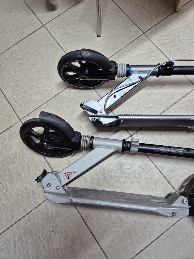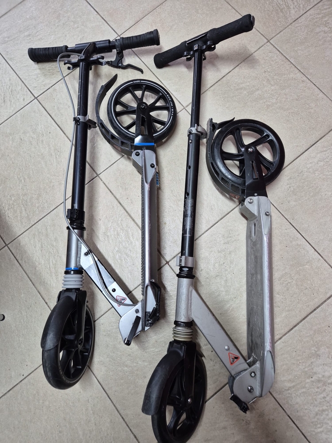 * Ambele au suspensii, roti mari de 200 mm din poliuretan, potrivite pentru utilizatori cu inaltime intre 1,45 m si 1,95 m si suporta maximum 100 kg.