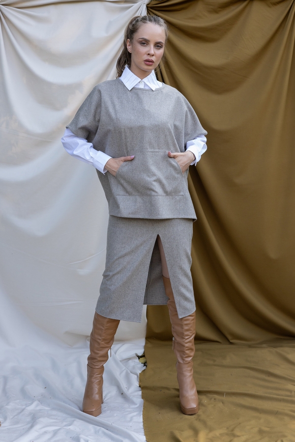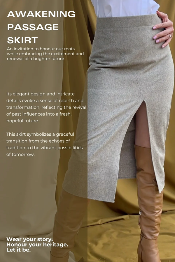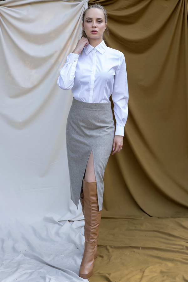 slit frontal orientat pe piciorul stang, continuat de cusaturi ornamentale pentru un efect de alungire a siluetei