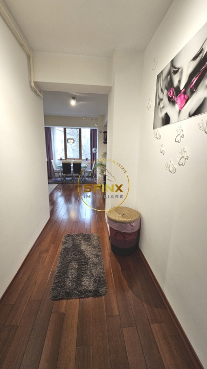 Cu o suprafata utila de 85 mp, apartamentul este compus dintr-un living generos cu bucatarie deschisa (48 mp), un dormitor spatios (24 mp), baie si doua holuri. Totul este impecabil, de la parchetul si usile din lemn, pana la mobilierul de calitate. Dispune de multiple spatii de depozitare, atat pe hol, cat si in dormitor, unde se afla un dressing de mari dimensiuni, pe intregul perete.