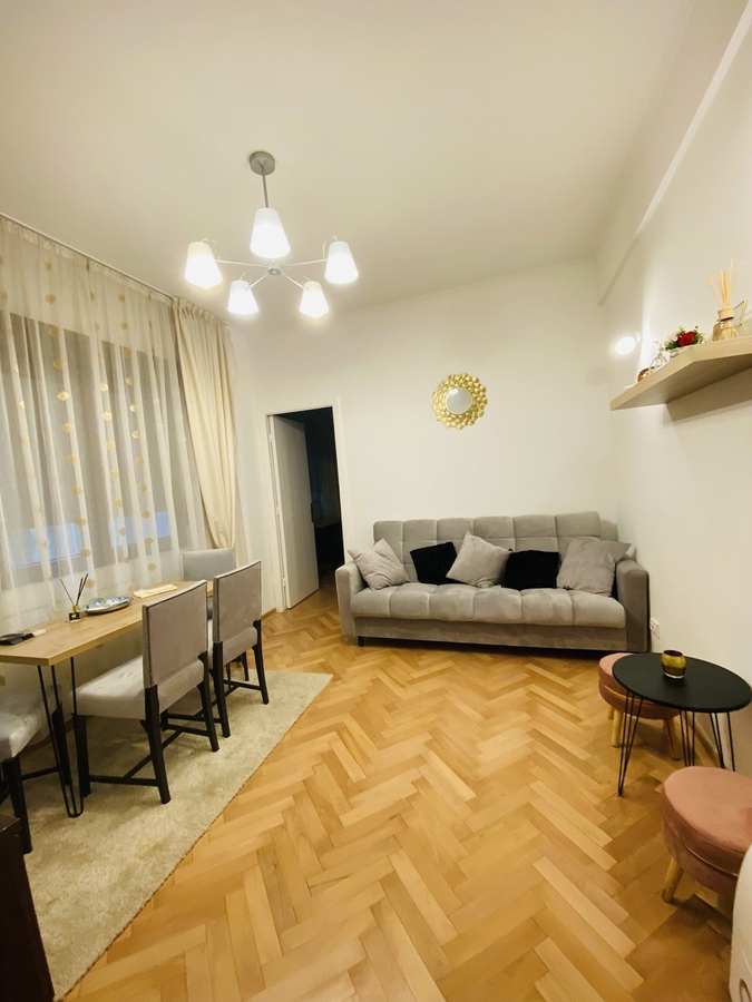 Apartamentul se afla la parter inalt cu vedere in curtea interioara si este format din 2 camere baie si o bucatarie mica care este cu balcon unit. Apartamentul este proaspat renovat cum se poate vedea si in poze si are centrala proprie cu calorifere si termostat reglabil , aer conditionat , plita pe gaz si electric, internet si tv prin cablu DIGI . In apartament precizez ca nu se fumeaza si nu se accepta cu animale !