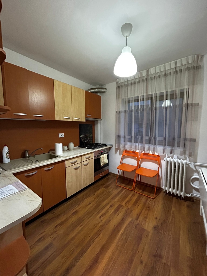 2 camere confort 1 decomandat, mobilat tineresc, etaj 2/10, frigider, aragaz, masina de spalat, gresie, faianta, parchet, termopan, loc de parcare 50 euro.