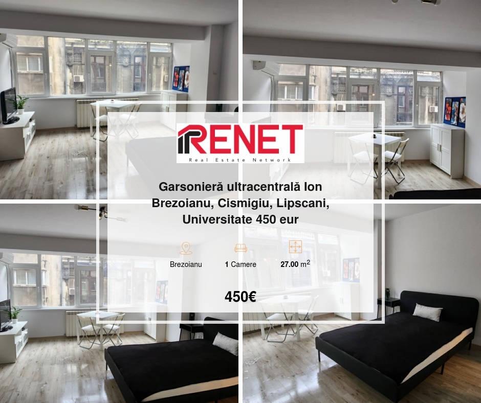 Garsoniera ultracentrala de inchiriat, str. Ion Brezoianu, la cateva minute de mers pe jos de Cismigiu, Calea Victoriei, Lipscani si Piata Universitatii.