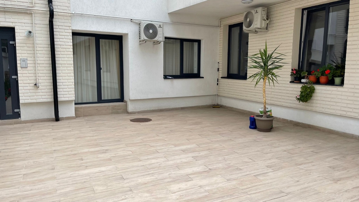 Acces direct la o curte comuna amenajata, cu pomi, flori si o atmosfera de comunitate placuta