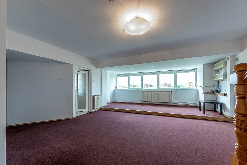 duplex, stradal, 4 camere mari, jaluzele externe, mochetat, zugravit, 2 bai, aer conditionat in toate partitiile, vedere spre biserica, bucatarie utilata, retea calculatoare trasa, pretabil firme,