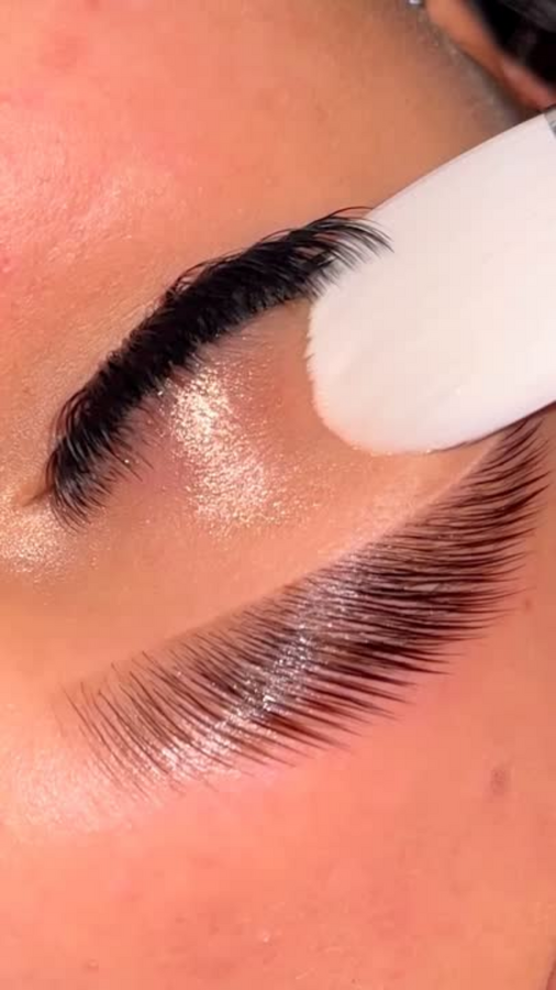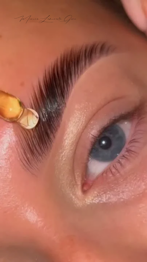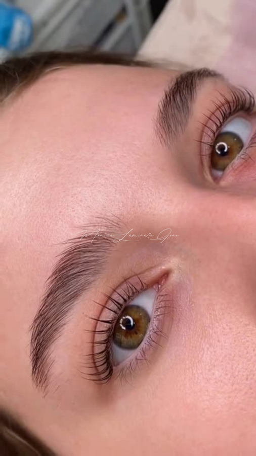 Laminare gene & sprancene in Bucuresti, realizata cu produse profesionale DLUX, pentru un efect natural, fara rimel zilnic.