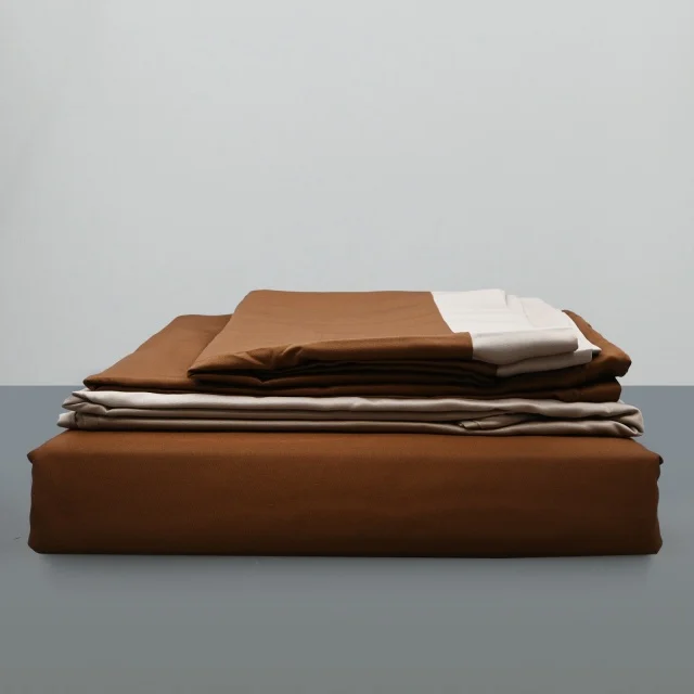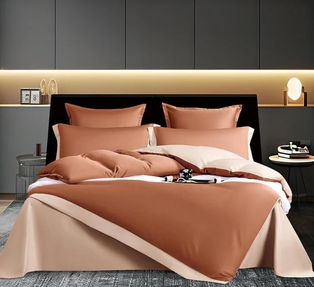 Lenjerie de pat din matase de culoare caramiziu cu crem, pentru pat dublu, cu 6 piese (cearceaf de pat fara elastic, husa pilota si 4 fete de perna), eleganta, fina la atingere, perfecta pentru saltele cu dimensiunea de 140 x 200 cm, 160 x 200 cm si 180 x 200 cm.