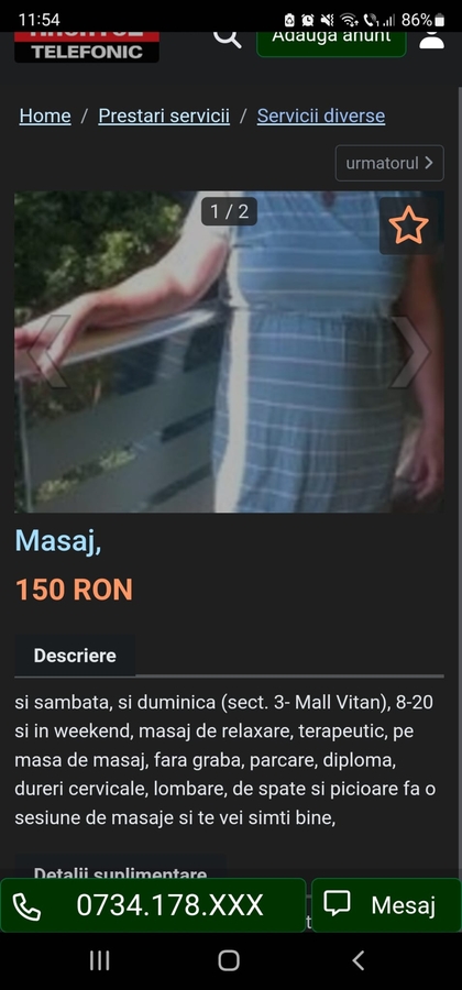 Se face masaj pe spate, picioare, talpi (la cerere), masaj facial, capilar, masaj anticelulitic, de relaxare (cu manevre usoare pe tot corpul).
