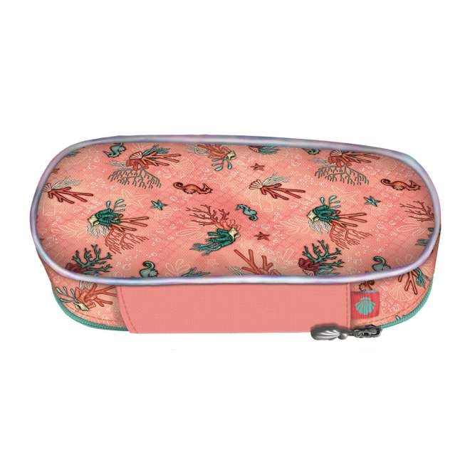 Penarul oval Gorjuss imbina designul deosebit al acestei game de produse cu utilitatea unui penar compact dar spatios in acelasi timp. Se inchide cu fermoar metalic asortat, cu cheita in forma de scoica. Include o extensie cu elastice pentru instrumente de scris dar si suficient spatiu pentru diverse rechizite: radiera, ascutitoare, rigla, alte instrumente de scris sau colorat. Include un buzunar din plasa cu fermoar pentru articole marunte.