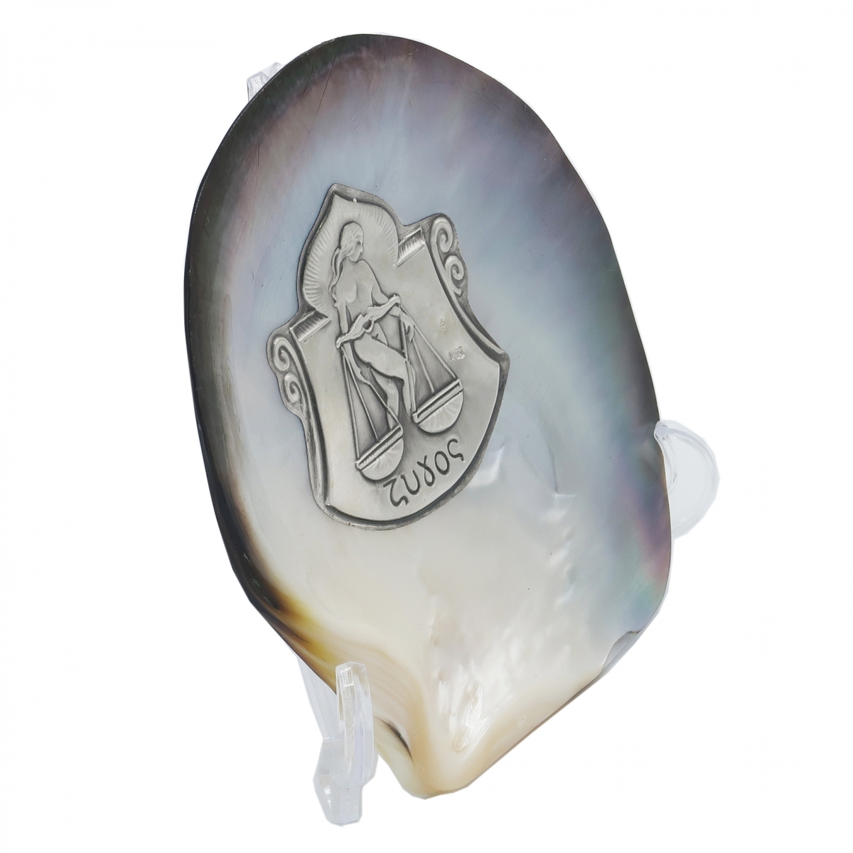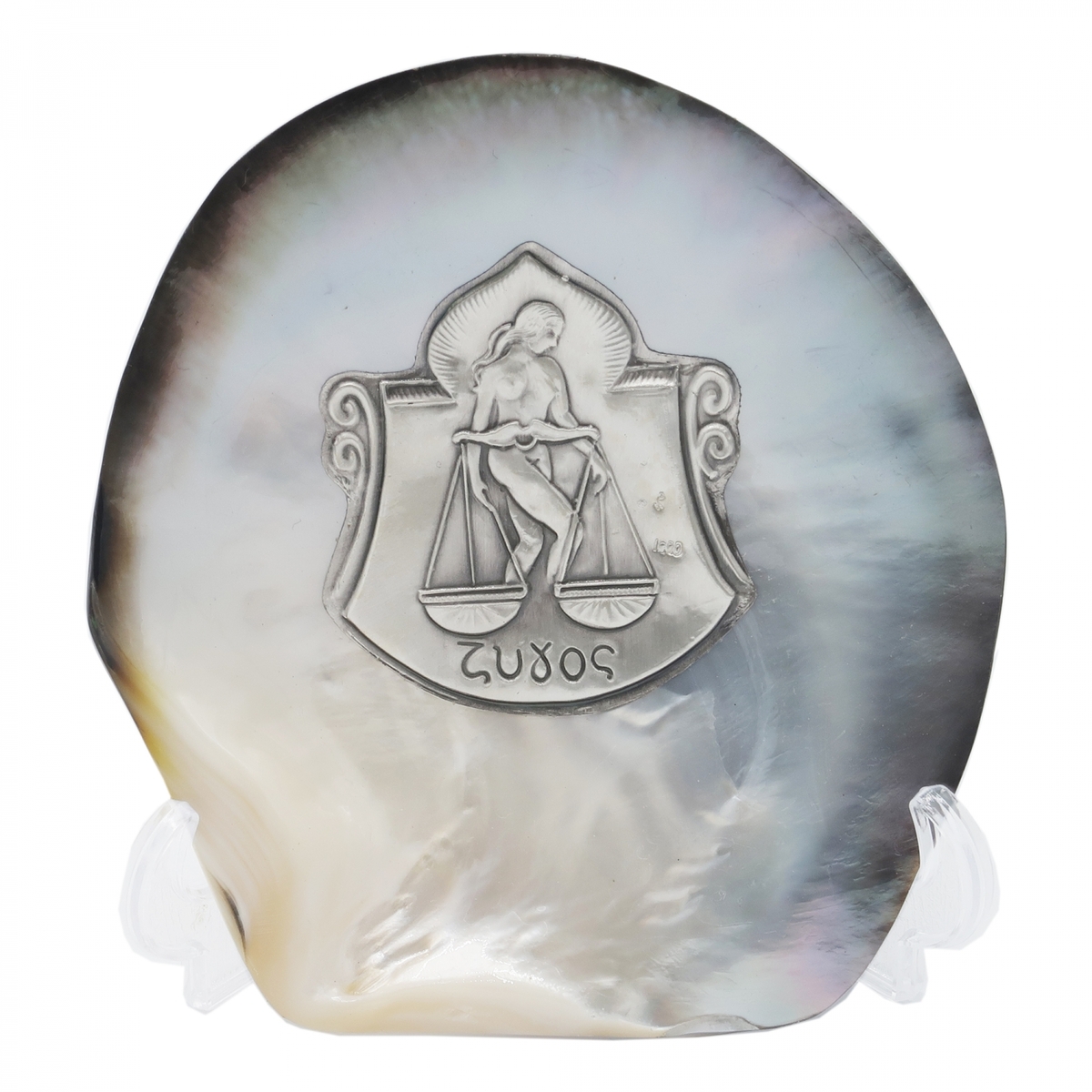 Montura robusta in argint, turnat, presat si cizelat, placheta circulara decorata in basorelief cu simboluri reprezentative pentru semnul astral BALANTA.