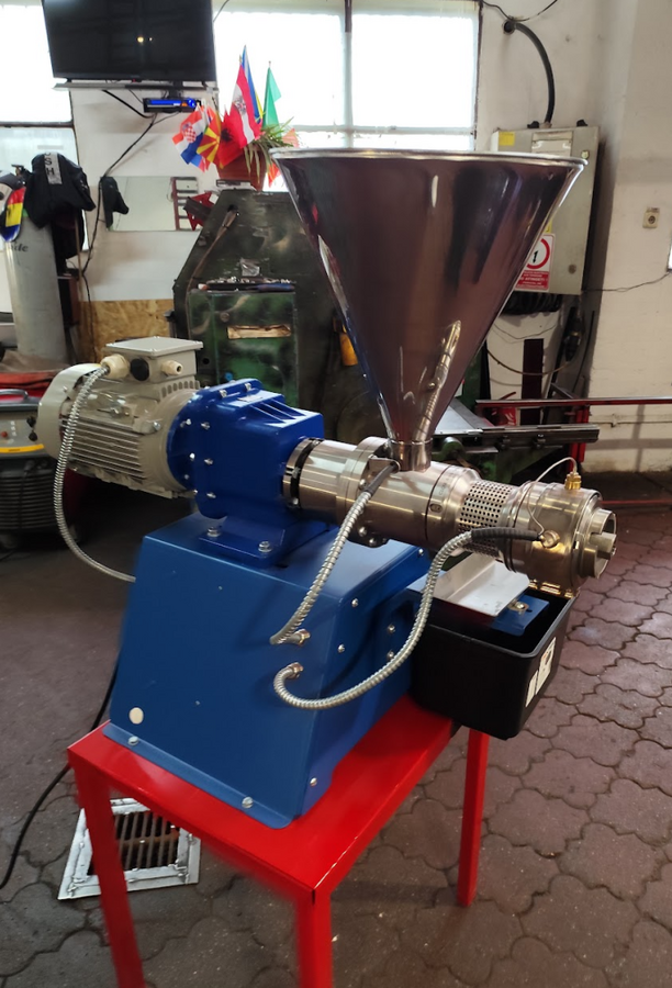 Presa ulei 220V, motor 2.2 kW, rezistenta 0.8 kW, proceseaza 19-40 kg seminte pe ora si produce intre 6.8 si 10 litri de ulei brut de floarea-soarelui.