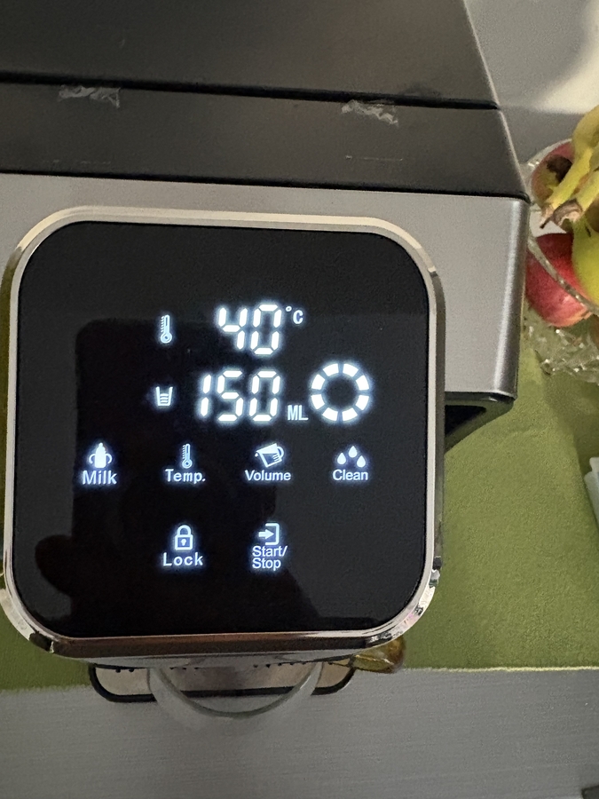 🔒 Touch screen elegant cu functii: Milk, Temp, Volume, Clean, Lock, Start/Stop.
