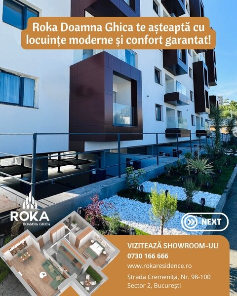 Ansamblul rezidential Roka Residence Doamna Ghica se va compune din 6 blocuri, momentan doua sunt in constructie, dotate cu lift si parcari subterane. Accesul este securizat, iar locurile de joaca si spatiile verzi amenajate va vor invita la relaxare.