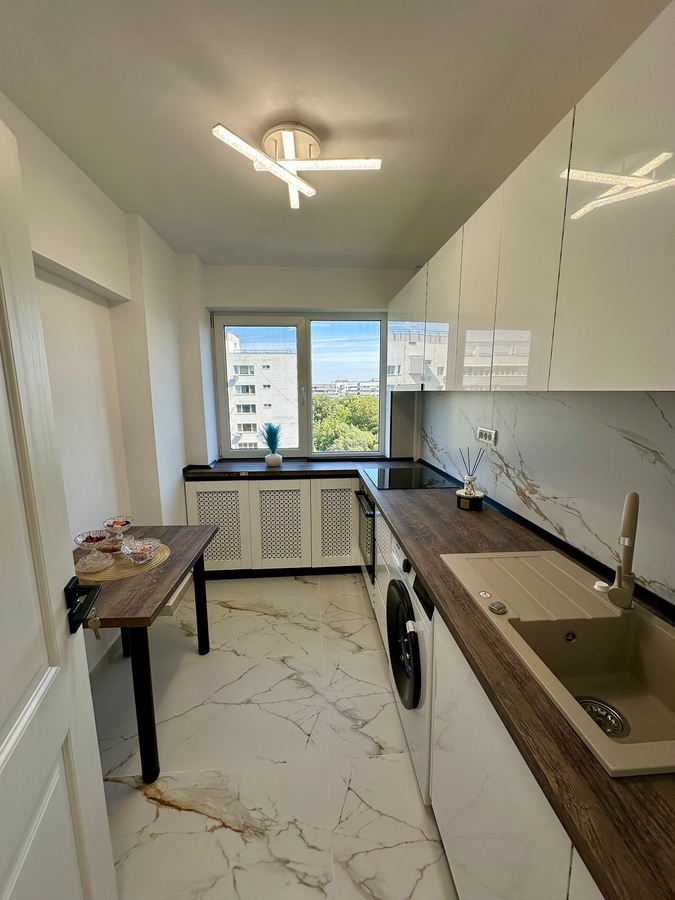 et 8/9, cf. 1, 50 mp, proaspat renovat, totul este nou, instalatii electrice si obiecte sanitare noi, mobila pe comanda, electrocasnice noi si in garantie, bloc semistradal, scara foarte curata si bine intretinuta, blocul dispune de lift, supraveghere video, acces interfon. Din punct de vedere juridic toate actele sunt pregatite pt vanzare. Imobilul se vinde exact ca in poze, acesta nu a fost locuit dupa amenajare.
