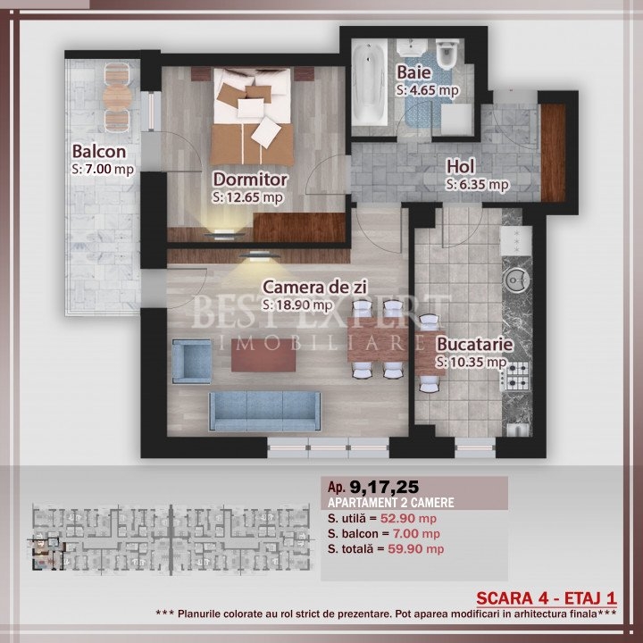 Suprafata utila - 52.9 mp utili +7 mp balcon, total 59.9 mp utili