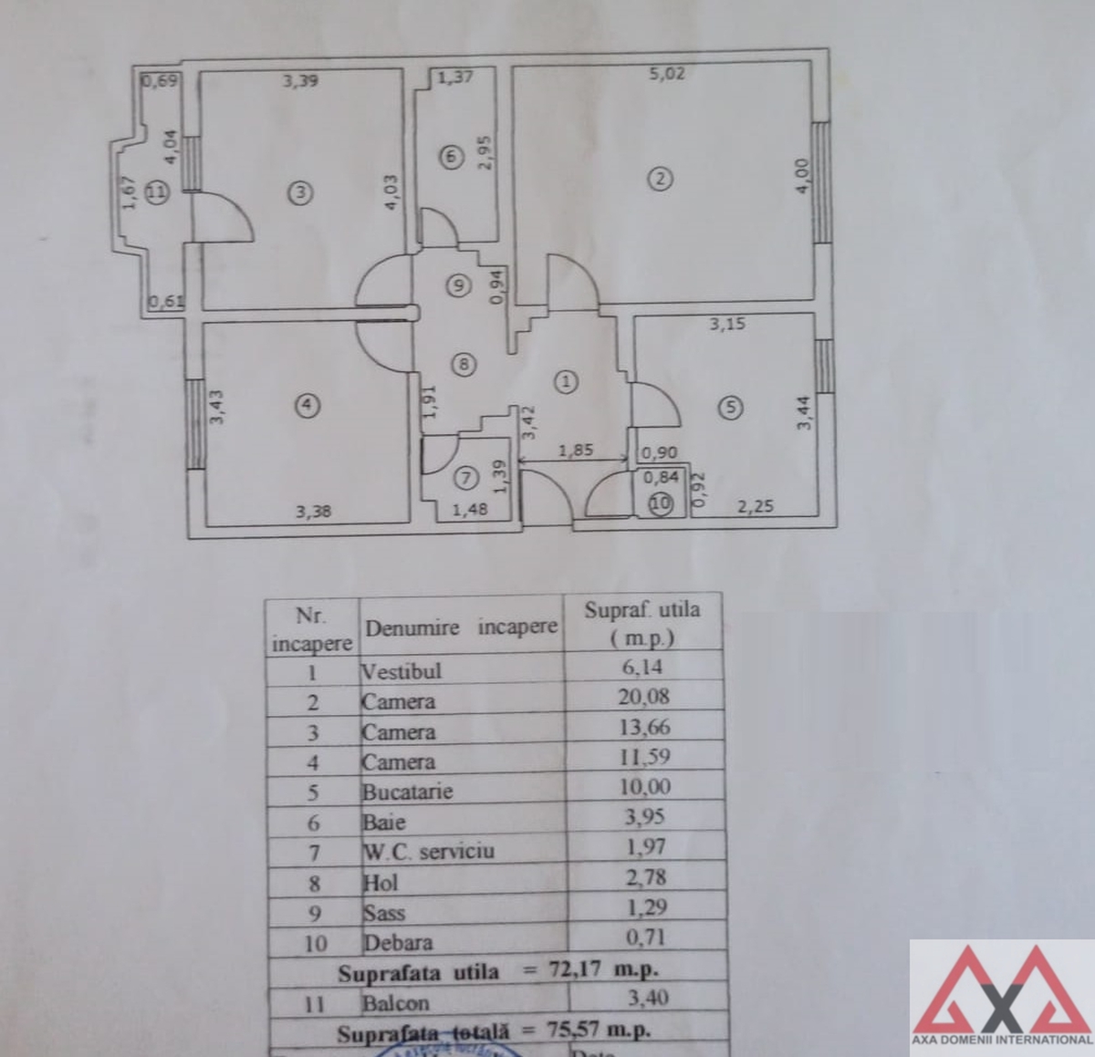 Suprafata totala este de 75.57 mp, iar cea utila, fara balcon, este de 72.17 mp.