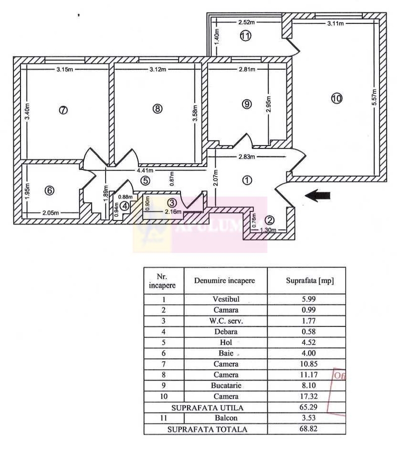 Locuința are o suprafață utilă de 69 mp și este compartimentată astfel: un living, o bucătărie, două dormitoare, doua băi (din care una este de serviciu), o debara, două spații de depozitare și un balcon. Apartamentul este decomandat, se află la etajul 7 din 8 și se vinde parțial mobilat.