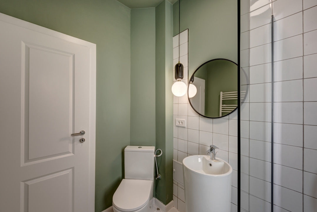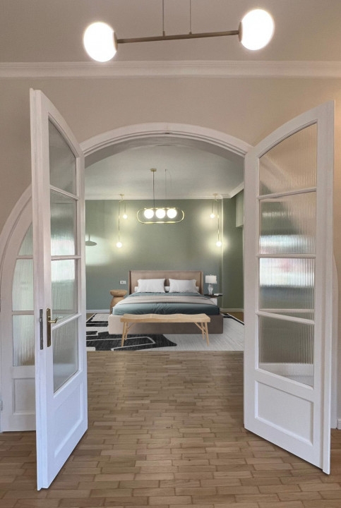 Pardoselile din dormitoare si living sunt placate cu parchet din lemn. Parchetul din cele doua camere care comunica a fost restaurat (scos, refacut si remontat) iar cel din al doilea dormitor a fost inlocuit cu unul nou (tot parchet din lemn). Usile interioare au fost inlocuite, cu exceptia glazvandului original care a fost reconditionat total (revopsit, inlocuit sticla). Baia a fost amenajata in acelasi stil si este dotata cu dus walk-in, lavoar si toaleta. Design-ul baii este construit in jurul stilului retro prin amenajarea cu faianta alba, vopseaua verde fistic si este completata cu un usor aer industrial prin cateva elemente contrastante: corpuri de iluminat negre, oglinda cu rama metalica neagra si o bagheta contur neagra. Baia beneficiaza de fereastra generoasa pentru aerisire naturala.