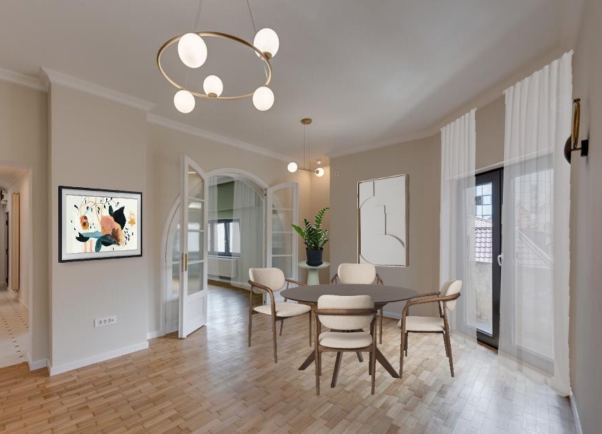Apartamentul a trecut printr-un proces de amenajare completa coordonat de catre un o echipa de profesionisti din cadrul unui Studio de design interior. Tot procesul de renovare a durat 6 luni. Intreaga amenajare urmareste stilul retro-clasic. Amenajarea a inclus refacerea peretilor, sapa noua, refacerea tuturor circuitelor electrice (cupru) si de apa ( tevi Uponor), inlocuirea centralei termice (Proterm din grupul Vaillant), inlocuirea ferestrelor (Veka- 5 camere, geam tripan), reamenajarea baii, reamenajarea bucatariei, refacerea pardoselilor. Peretii au fost regletuiti, s-au montat plase si au fost vopsiti cu vopsea lavabila premium( San Marco). Inclusiv tavanele au fost retencuite si nu au fost placate cu rigips.