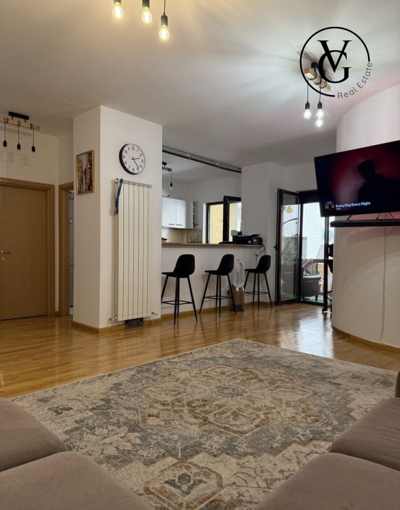 Apartamentul dispune de un loc de parcare subteran, inclus in pret. Imobilul se va preda semimobilat si beneficiaza de parchet din lemn masiv, rulouri electrice, pergola, plase exterioare, precum si de electrocasnice premium AEG.