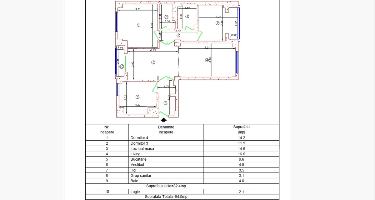 Apartamentul a fost modificat cu proiect si autorizatie, avand acum un living (camera de zi + loc de luat masa) foarte spatios - 31 mp si luminos, cu geamuri pe ambele parti ale blocului, bucataria - 10 mp, un dormitor matrimonial cu dressing - 14 mp si un dormitor mic cu logia inclusa in suprafata utila - 12 mp. Baile au fost si ele modificate, avand acum amandoua cada. Vezi schita atasata.