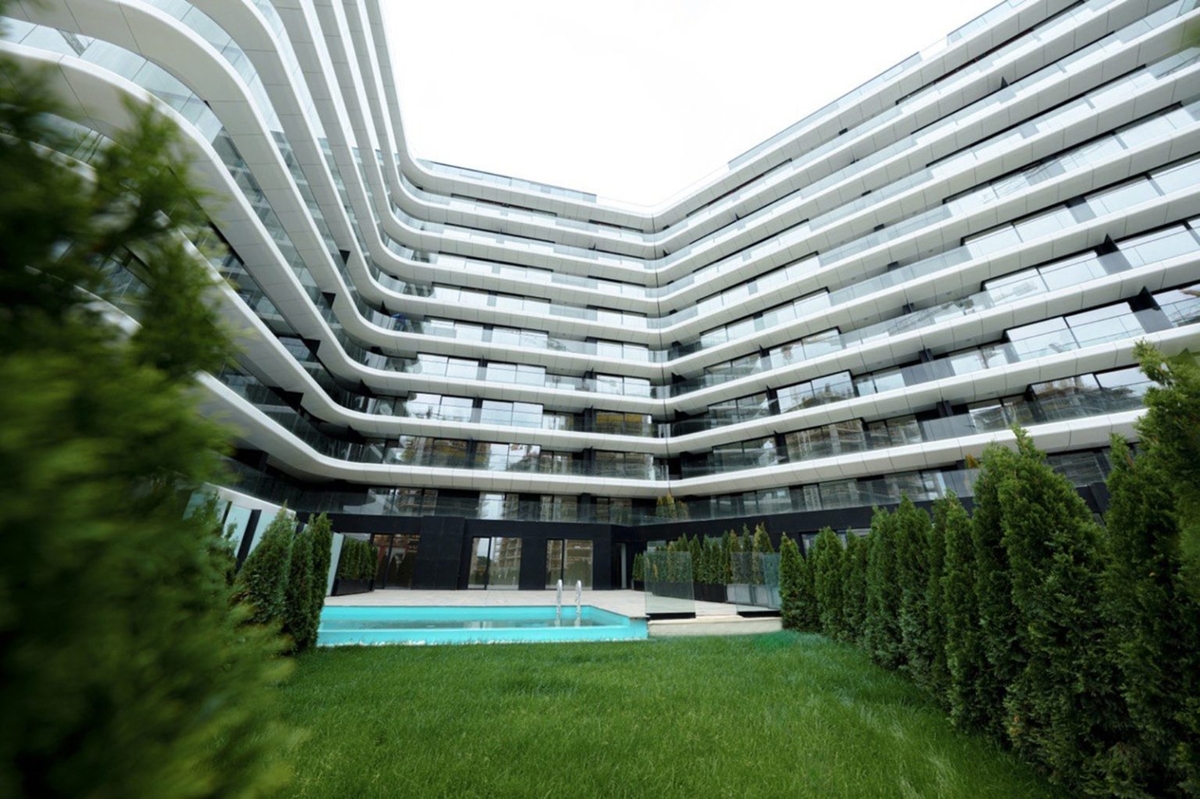 Apartament 3 camere compus din living generos cu zona de dining, o bucatarie open space, doua dormitoare confortabile, doua bai elegante si un balcon cu vedere spre lac, in complex Yacht Kid.