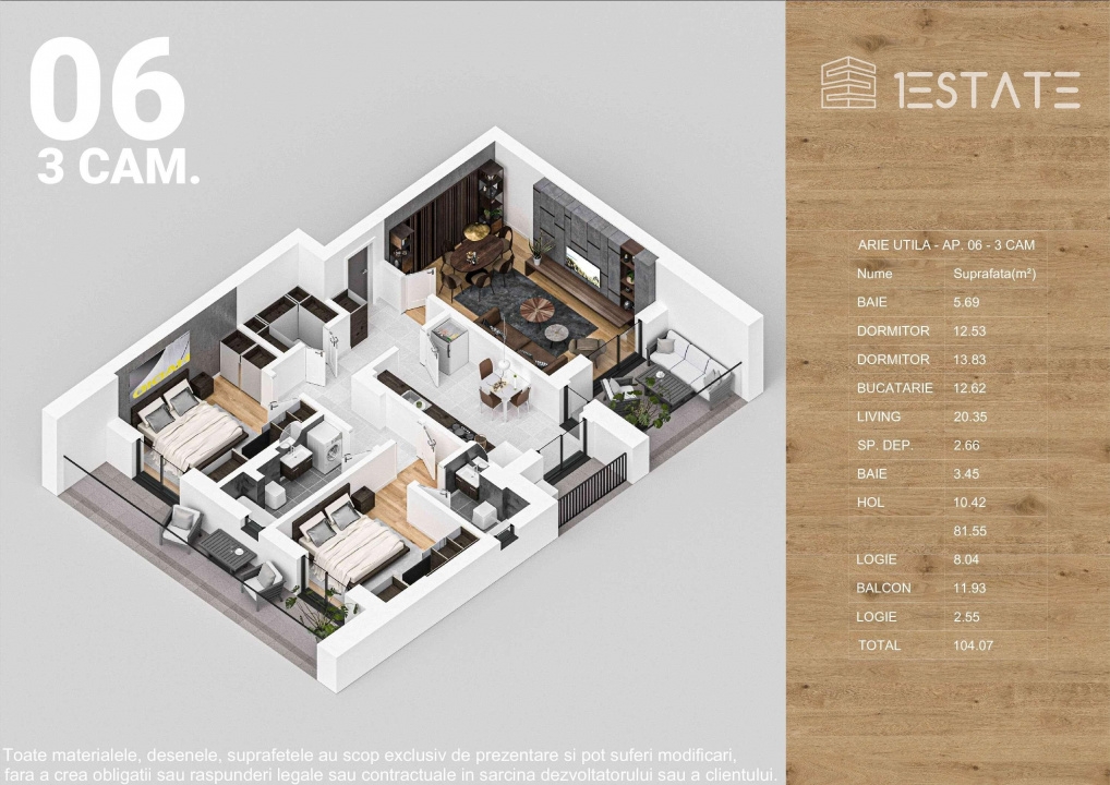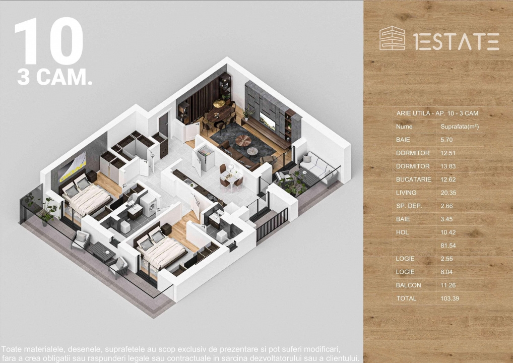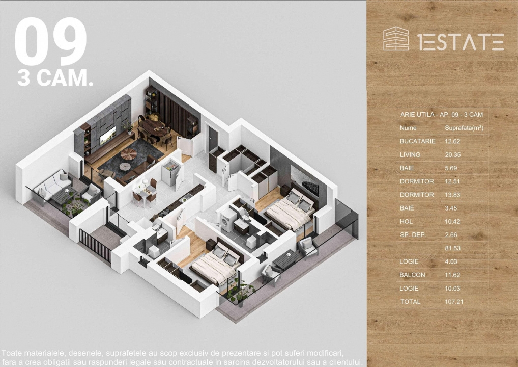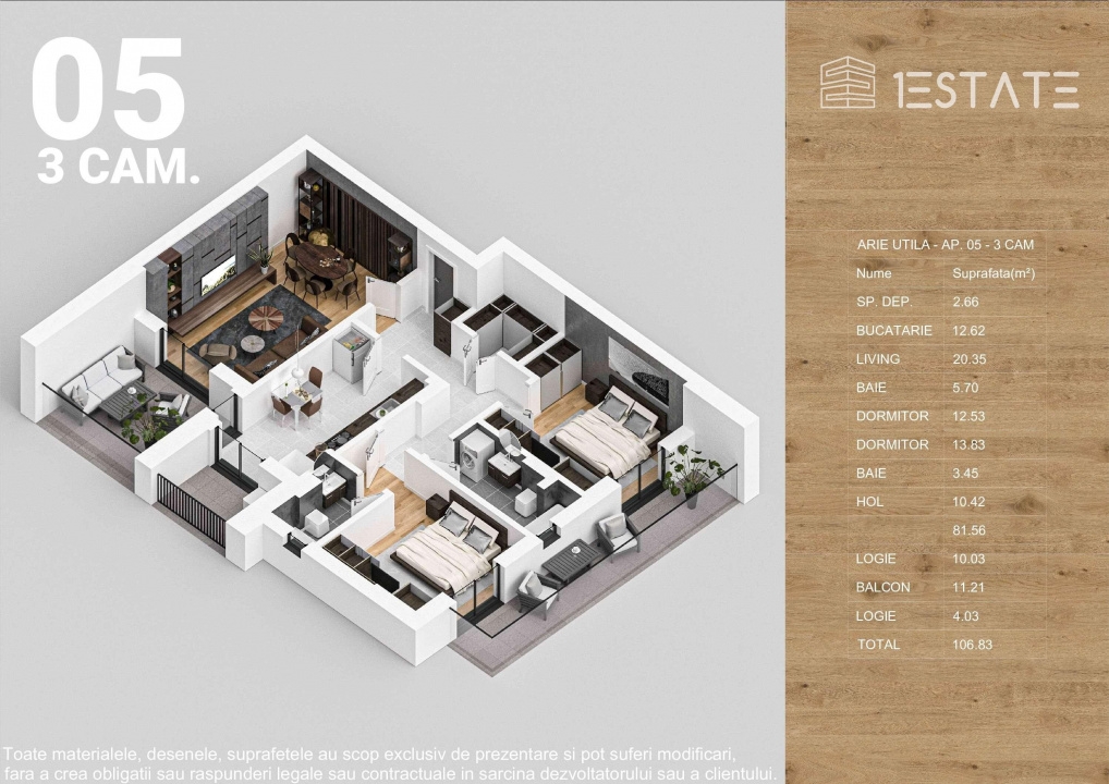 Apartament 3 camere, avand urmatoarele caracteristici: