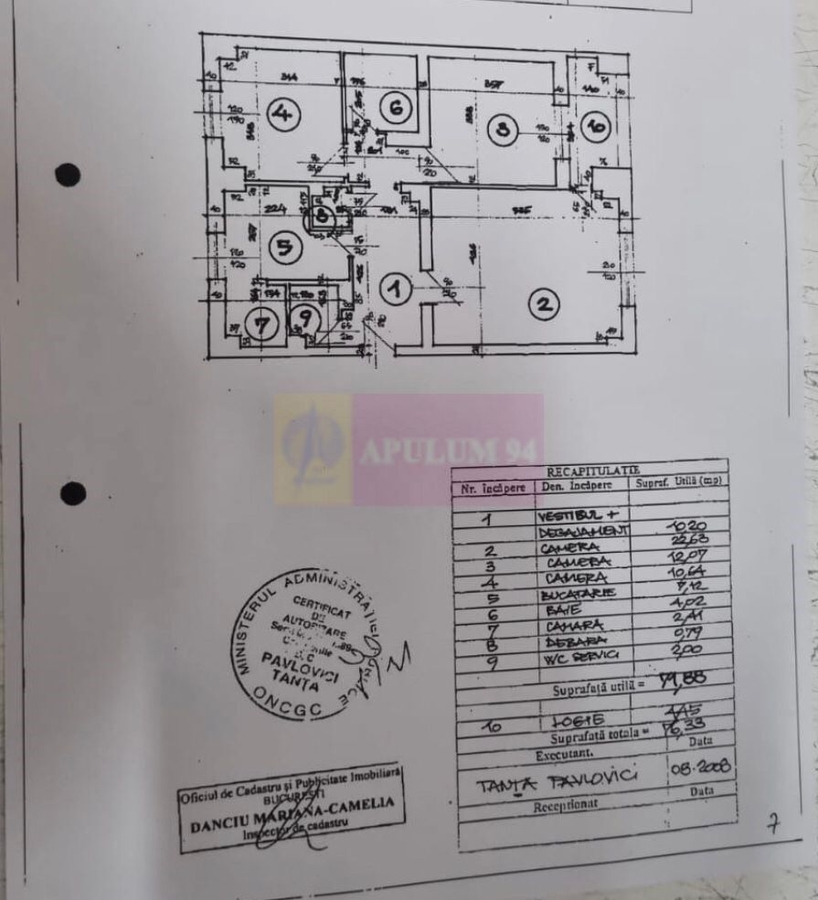 Va oferim spre vanzare un apartament 3 camere decomandat 77 mp. Et 7/8 decomandat, bloc 1995, cu vedere mixtă, si 2 grupuri sanitare, 1 balcon logie. Are Centrală proprie pe gaz! Instalație electrică refăcută Gewiss, instalație sanitara noua, parchet natural stejar. Suprafata este de 76mp. Apartamentul este liber si nemobilat. Actele sunt la zi cu Cadastru si Intabulare facute.