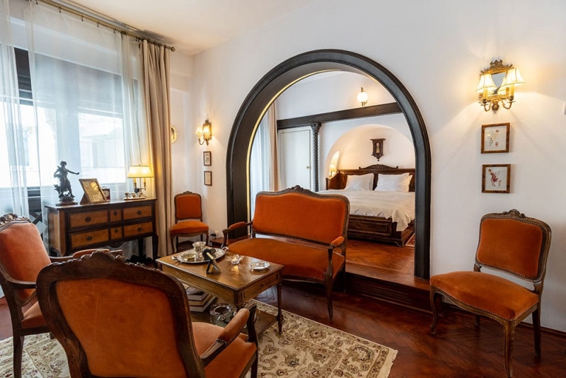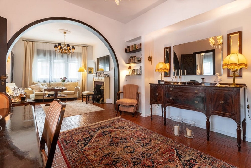 Apartamentul se afla la etajul 5 intr-un bloc postbelic ( 1946) si este rezultatul contopirii a doua proprietati - un apartament de 3 camere si un studio dublu ( din punct de vedere juridic sunt doua unitati locative). Este organizat astfel: un dormitor principal cu zona proprie de relaxare, baie si spatii de depozitare, 2 balcoane, 1 terasa privata si o chicineta. Dormitorul principal este legat de apartamentul de 3 camere si doua bai (unul dintre dormitoare are baie proprie, cu cada), printr-o usa camuflata intr-un dulap, putand astfel sa fie folosit si separat, ca studio, dar si impreuna cu capartamentul de 3 camere, usile principale de intrare in cele doua apartamente fiind pastrate, in holul blocului. Apartamentul de 3 camere este compus din dining, living, o baie pentru musafiri, cu dus, un dormitor matrimonial cu baie proprie, cu cada, o bucatarie complet echipata (inclusiv masina de spalat vase), o spalatorie (cu masina de spalat si uscator), un balcon, o terasa privata, dulapuri si spatii de depozitare. Proprietatea beneficiaza de sistem de incalzire pe gaze, cu centrala termica, controlat prin Wifi, sistem de aer conditionat si 3 boxe in subsol. Toate ferestrele au tamplaria si obloanele originale din lemn, reconditionate perfect.