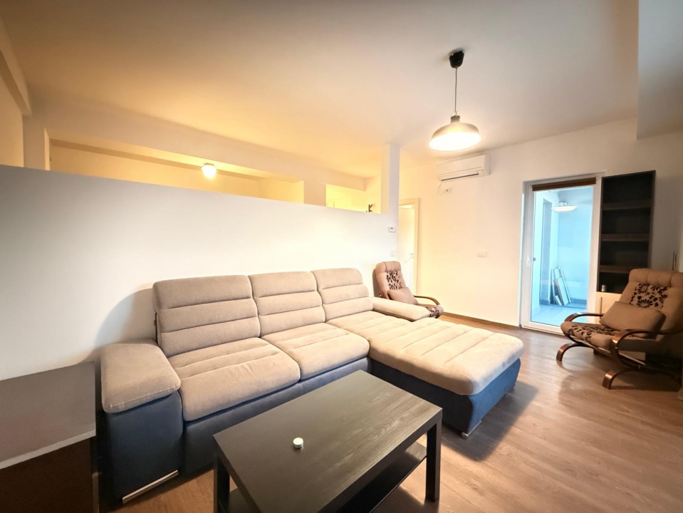 Living-ul este luminos si aerisit, cu canapea extensibila generoasa (tip coltar cu sezlong), fotoliu comod si zona de dining – perfect pentru seri relaxante sau intalniri cu prietenii. Peretele despartitor elegant creeaza un design modern cu open-space partial, pastrand intimitatea dormitorului.