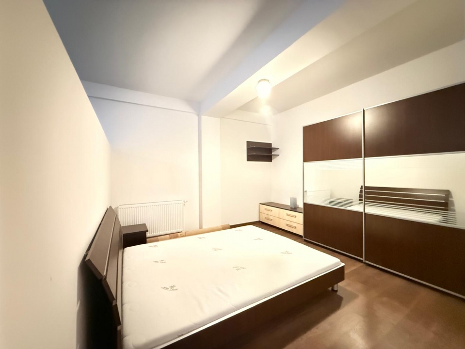 Dormitorul matrimonial este surprinzator de spatios: pat king-size, dulapuri incorporate cu usi glisante mari (oglinda + spatiu de depozitare excelent), noptiere, lumina naturala abundenta si tavan inalt – un adevarat refugiu de relaxare.