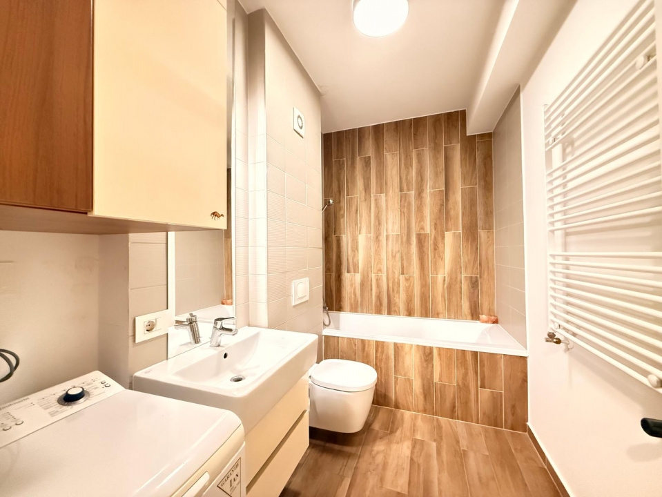 Baia moderna si luminoasa: cada spatioasa, lavoar cu dulap, oglinda iluminata LED, masina de spalat inclusa, finisaje calde si elegante in tonuri de lemn & bej.