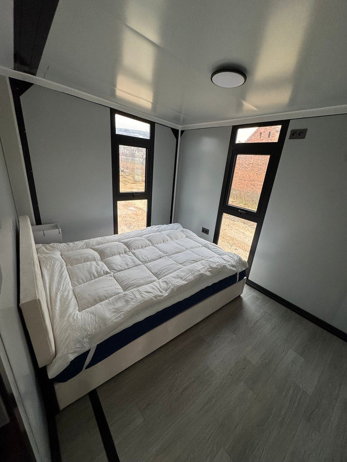 Suprafata - 38 mp, formata din dormitor, baie si living cu bucatarie open space. Are 2 pereti de sticla, usa sticla, baie completa, mobila de bucatarie, finisata interior si exterior, pereti exteriori de panou sandwishcu Rockwool,sitabla embosata caramida rosie la exterior, cadru metalic si geamuri albe.