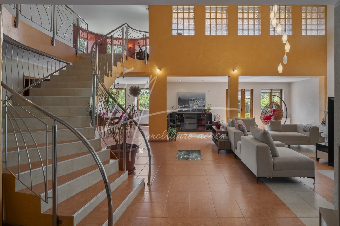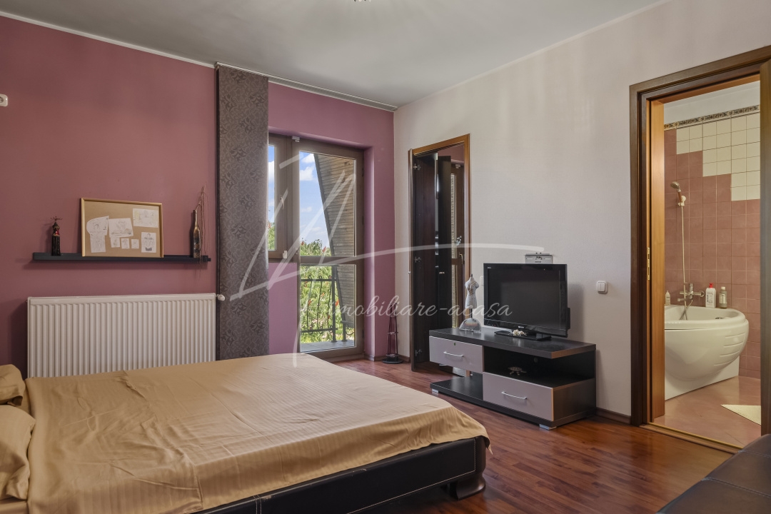 Scara interioara generoasa, curbata, conduce catre holul imens de la etaj cu vedere catre living si acces in terasa ce iti confera un peisaj placut ochiului, al zonei din spatele casei. Dormitoarele in numar de 5, fiecare cu baie proprie, sunt comandate de holul larg, de asemenea cu vedere catre living-ul parterului.