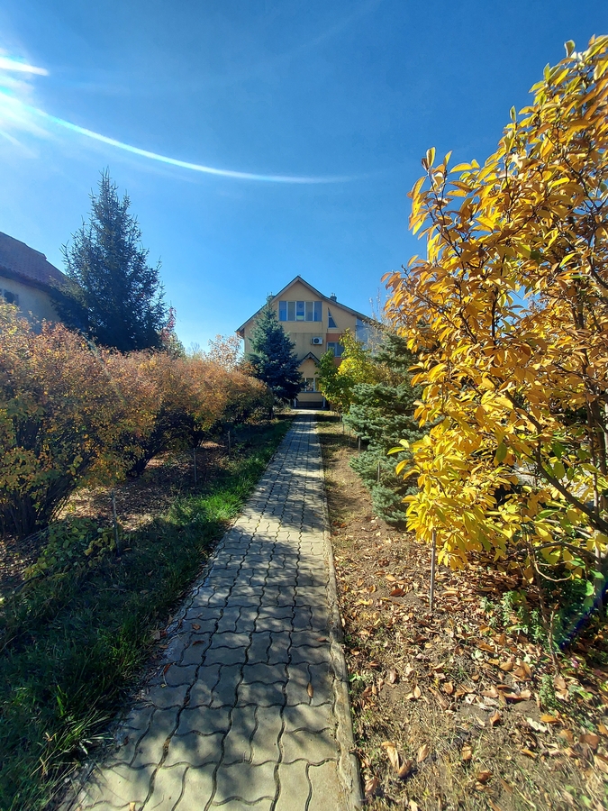Teren complet imprejmuit, amenajat cu alei, rigole de scurgere, copaci si plante ornamentale.