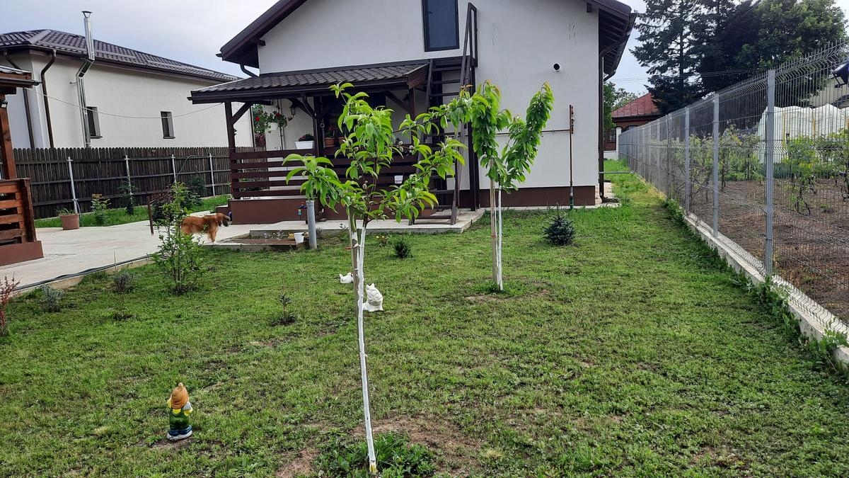 Curtea are pomi fructiferi, care produc deja fructe, smochini, muri, zmeuri, brazi, leandri, magnolii, alee cu trandafiri etc, alei pavate cu posibilitate parcare in curte pentru 4 masini.
