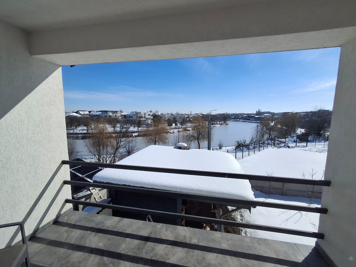 Parterul este compus din living, baie, bucatarie, terasa, spatii depozitare si camera tehnica. La etaj sunt doua dormitoare spatioase, fiecare cu baie si dressing individual. Ambele dormitoare sunt dotate cu balcon si ofera o vedere superba catre lac.
