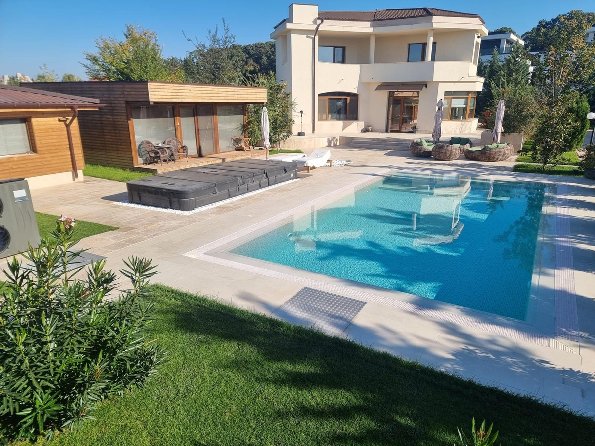 Vanzare vila eleganta amplasata intr-o zona rezidentiala exclusivista din Snagov. Imobilul, edificat in 2013, pe un teren de 2481 mp, cu deschidere stradala de 32 ml, este structurat P+1E si beneficiaza de curte prevazuta cu gazon, vegetatie matura si arbusti decorativi, la care se adauga zona de agrement alcatuita din piscina, foisor, anexa cu sala de sport si sauna si garaj cu 3 locuri de parcare.
