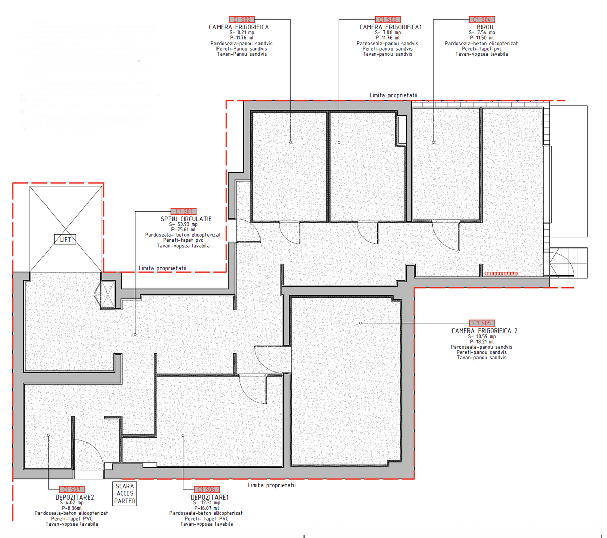 Subsol: 175 mp – include 3 camere frigorifice si acces cu rampa pentru TIR.