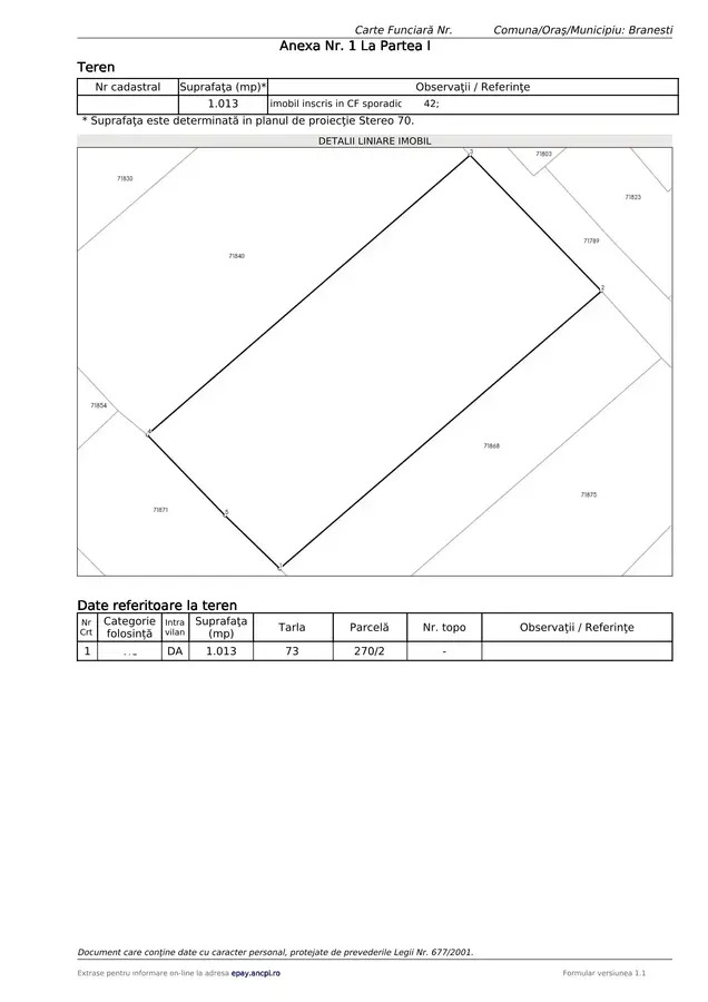 Va oferim spre vanzare un teren intravilan de 1013 mp, situat in localitatea Pasarea, Branesti, intr-o zona linistita, ideala pentru constructia unei locuinte sau a unei case de vacanta.