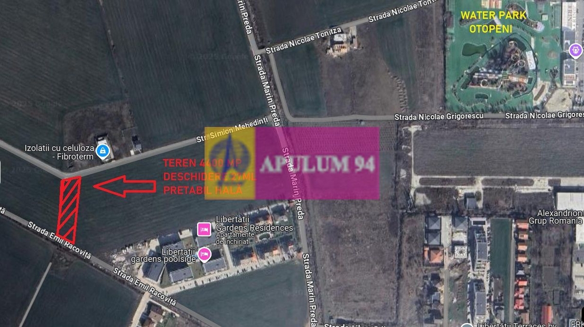 Va propun spre cumparare un teren de 4400 mp situat in localitatea Otopeni, localitate ce va fi deservita de metrou. Terenul se afla pe strada Simion Mehedinti (pe partea dreapta cum venim dinspre aeroport spre Bucuresti, cu acces din strazile Libertatii, respectiv Marin Preda. Are un front stradal de 27ml si este incadrat din punct de vedere urbanistic in zona mixta cu recomadari de constuctii hale sau activitati nepoluante. Terenul are potential si pentru rezidential invecinandu-se cu ansamblul rezidential Libertatii Gardens, este evident elaborarea unei documentatii specifice daca se doreste acest lucru. Terenul este pozitionat relativ in proximitatea Water Park otopeni, la 6-700ml de acesta. Din punct de vedere utilitati avem pe zona curent electric, apa si gaz dar distanta dintre teren si aceste utilitati este de cateva sute de metri. Terenul are documentatia necesara pentru tranzactie si avem proprietar persoana fizica. Avem o deschidere buna ce permite parcelare. terenul este foarte bun ca investitie. Avem certificat de urbanism valabil. Pentru mai multe detalii si informatii nu ezitati sa ma contactati, Daniel, Apulum94.