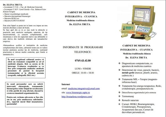 Diagnosticare computerizata, medicina cuantica,electropuncturala, afisare diagnostic medical total, complex, complet si energetic; virusi, paraziti, metale grele; recomandari homeopate; tratamente bio-energo-terapeutice cu MIL