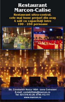 Situat in zona centrala a Bucurestiului (la 300 de metri de Podul Cotroceni) complexul Marcon - Calise este prezent din anul 1990 in peisajul restaurantelor bucurestene. Dispunand de patru sali cu capacitati de 90, 120, 200 si respectiv 350 de persoane, restaurantul nostru este alegerea ideala...
